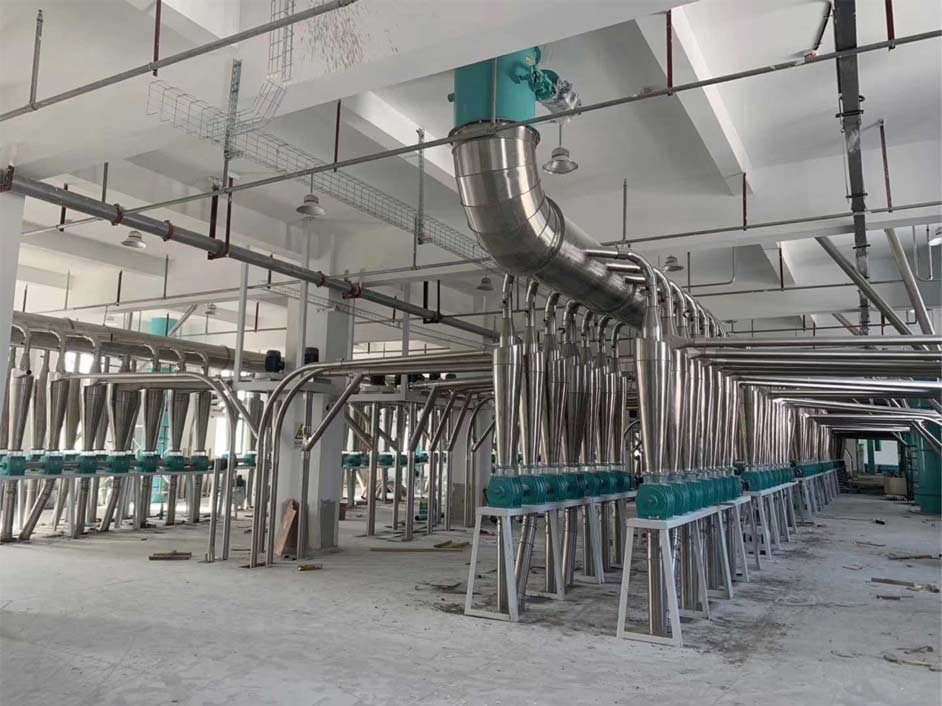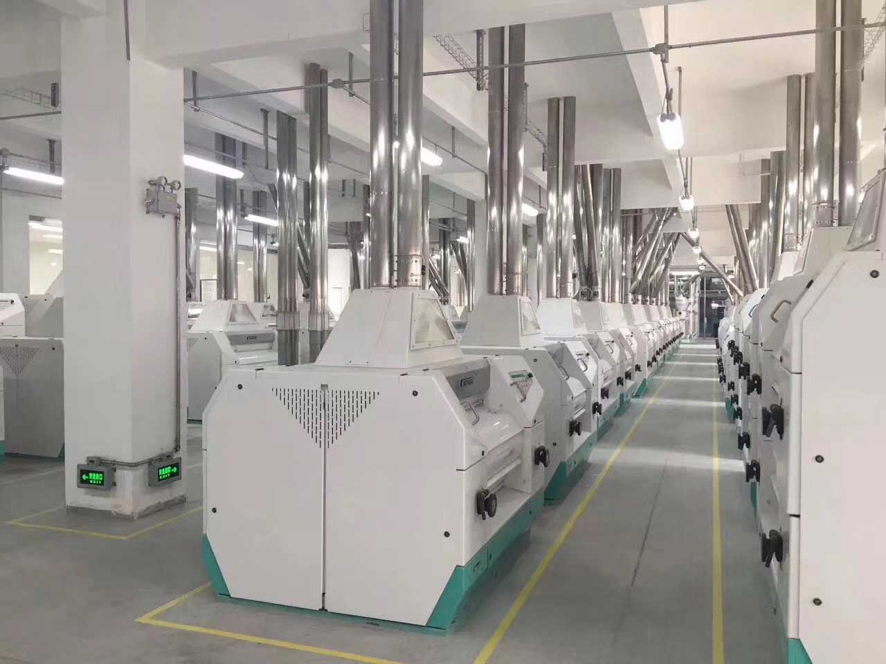 1000噸面粉加工設(shè)備,該工藝以小麥為原料,日處理小麥1000噸,是一條全自動生產(chǎn)線,清理、去石、打麥、除塵、著水、凈糧二次清理、輸送等工段。